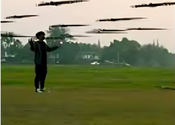 With a simple wave of his hand, entire formations of “blades” take off, hover, and move in stunning synchronized patterns.